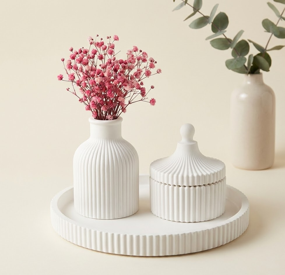 The Gilded Sanctuary Set is the ultimate expression of the SLAB LAB philosophy, blending clinical precision with raw, hand-applied luxury. This comprehensive collection features a tall, ribbed apothecary vase and a matching lidded trinket canister, both defined by deep vertical fluting. The set is elevated by a hand-poured "Swirl" sculptural candle resting on a delicate scalloped dish. Every piece is uniquely weathered with authentic gold-leaf accents and presented on a massive, precision-ribbed circular display slab that anchors the entire aesthetic.
